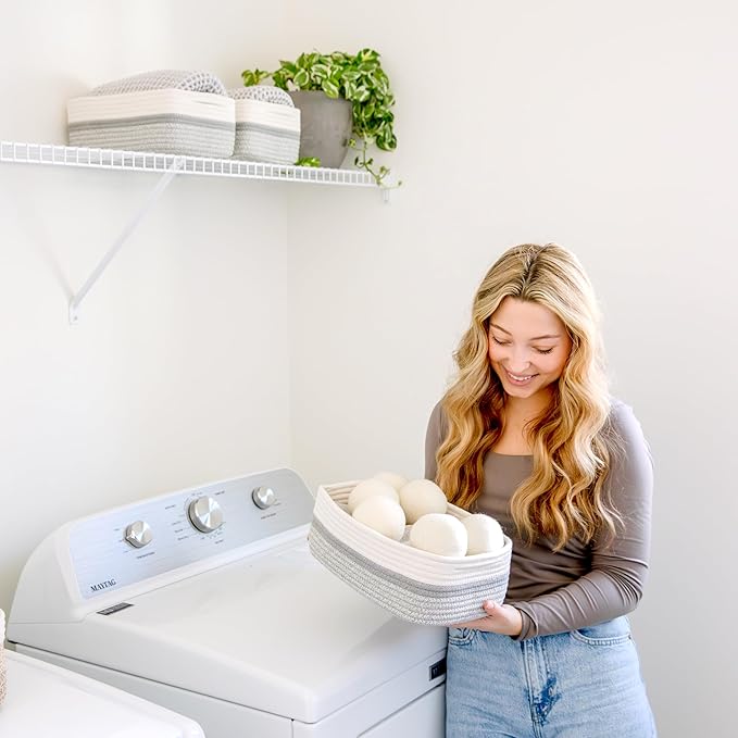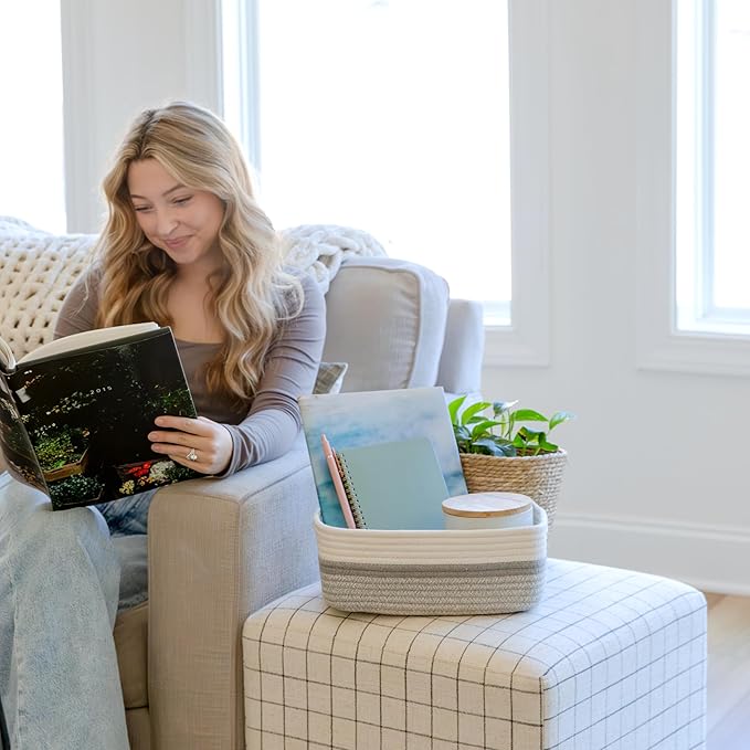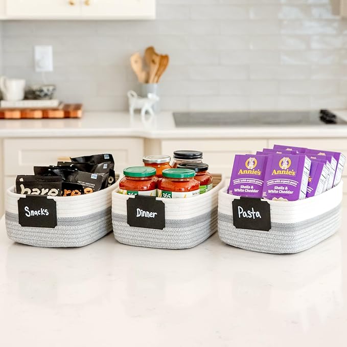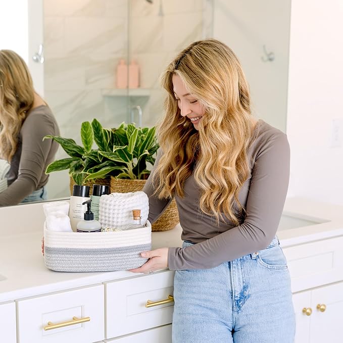 - Safe, Natural Cotton Organizer Bins: Crafted from the highest quality material in the market, our storage bins are oh-so-sturdy (and cute) and ready to take on little humans. They’re 100% safe, so you can rest easy if teething toddlers take a nibble. Reinforced Hidden Handles: Now you see ‘em, now you don’t! With completely hidden handles that blend seamlessly into the rope basket, you’ll be the Houdini of home organizing. They’re even double-stitched and reinforced for extra heavy loads!