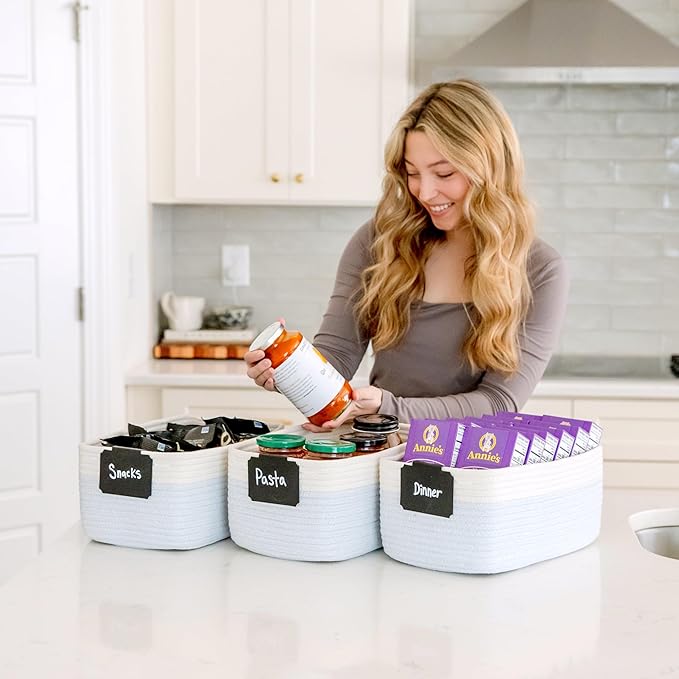 - Safe, Natural Cotton Organizer Bins: Crafted from the highest quality material in the market, our storage bins are oh-so-sturdy (and cute) and ready to take on little humans. They’re 100% safe, so you can rest easy if teething toddlers take a nibble. Reinforced Hidden Handles: Now you see ‘em, now you don’t! With completely hidden handles that blend seamlessly into the rope basket, you’ll be the Houdini of home organizing. They’re even double-stitched and reinforced for extra heavy loads!