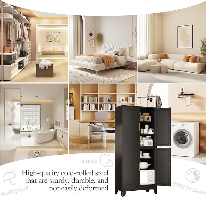 - 『♕Multifunctional Cabinet』Metal pantry are perfect for various environments and are an ideal choice for home offices, bedroom, livingroom, kitchen, study and more. You can use it as a pantry cabinet, food cabinet, kitchen cabinet, kitchen cupboard, utility cabinet, laundry room cabinets, bathroom cabinet, bedroom wardrobe, bookcase, tool cabinet, file cabinet, appliance cabinet, etc. Of course, you can also use it for any place you want to place it