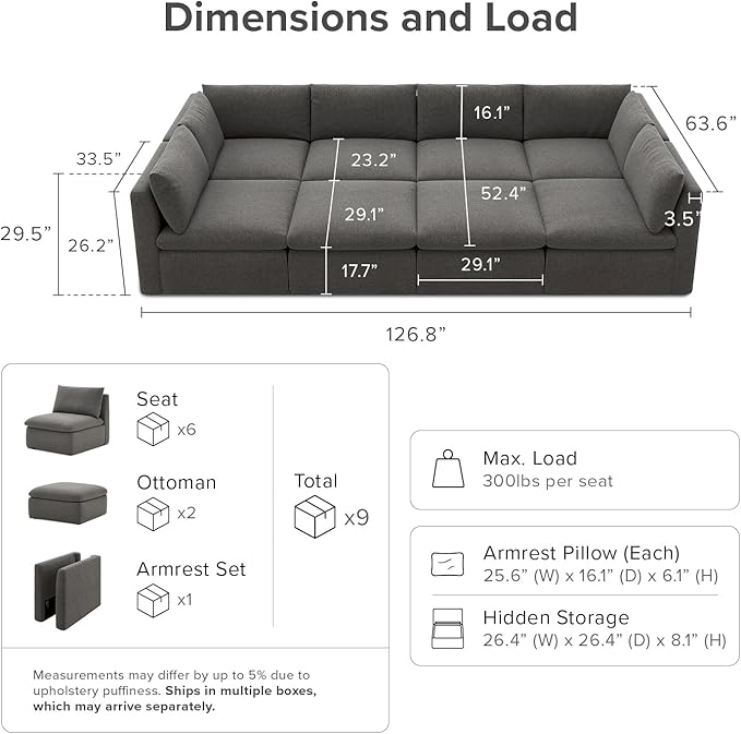 - Disclaimers: Colors may vary due to lighting and screen differences. Cushions are vacuum-packed and may take up to 7 days to fully expand. For best results, gently fluff and allow time to reach full volume. Measurements may differ by up to 5% due to upholstery puffiness. Ships in multiple boxes, which may arrive separately
