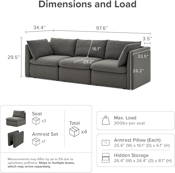 - Durable Build & Quick Assembly: FSC-Certified wood frame. Built to last, each seat supports up to 300 lbs, offering long-term durability without sacrificing comfort. Setup is easy, with a quick 15-minute assembly per unit, that locks everything securely in place, so you can enjoy your new couch without delay