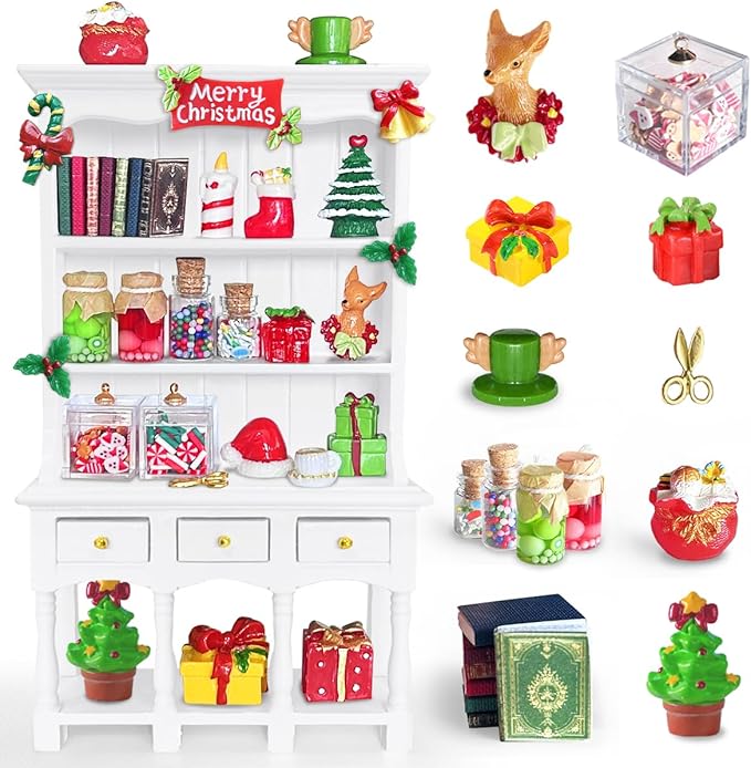 - dollhoDoll House Accessories and Furniture: Total 34 pcs Includes 1 cabinet, 7 books, 1 scissor, 1 Christmas card, 1 bell, 1 stocking, 1 coffee, 2 mini decorative boxes, 2 fruit jars, 2 candy jars, 4 gift boxes, 1 walking stick, 1 lucky bag, 1 deer, 1 deer hat, 1 Christmas hat, 1 candle, 2 leafages, 2 Christmas trees, 1 adhesiveuse furniture kit
