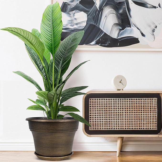 - 【TRADITIONAL DESIGN】Plastic planters for indoor plants with trays are designed in dark gold colors & a classic round look, which allow this pot to fit into any indoor & outdoor setting. With these golded flower pots, it could adds fresh, decorative flair to your home. Decorate your windowsill, desktop, shelf, bedroom, living room, kitchen, garden, office with our 10 inch plastic plant pot.