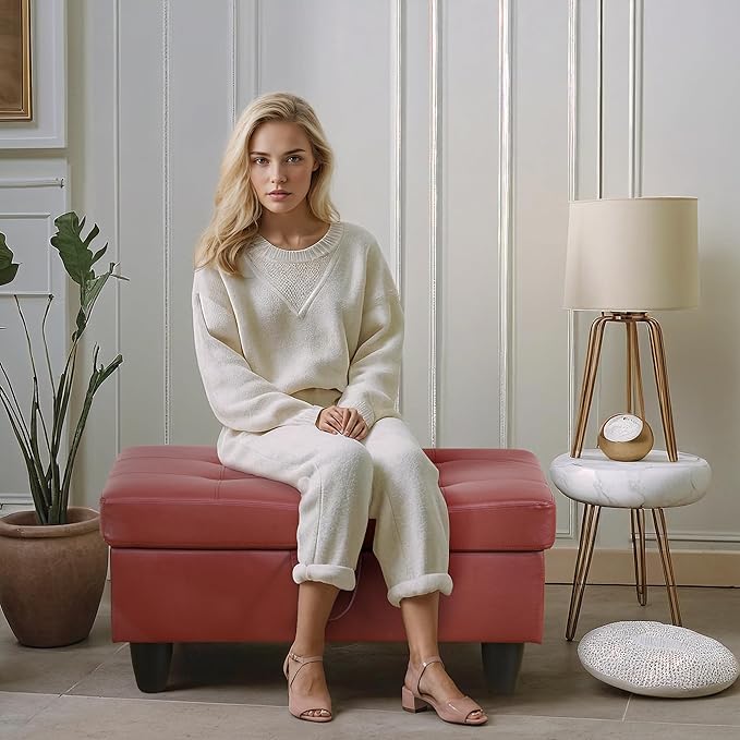 - OTTOMAN BENCH: This versatile storage ottoman doubles as a comfortable bench, perfect for entryways, living rooms, or bedrooms. Designed to blend style with functionality, it provides both extra seating and hidden storage, making it a practical and stylish solution for any space.