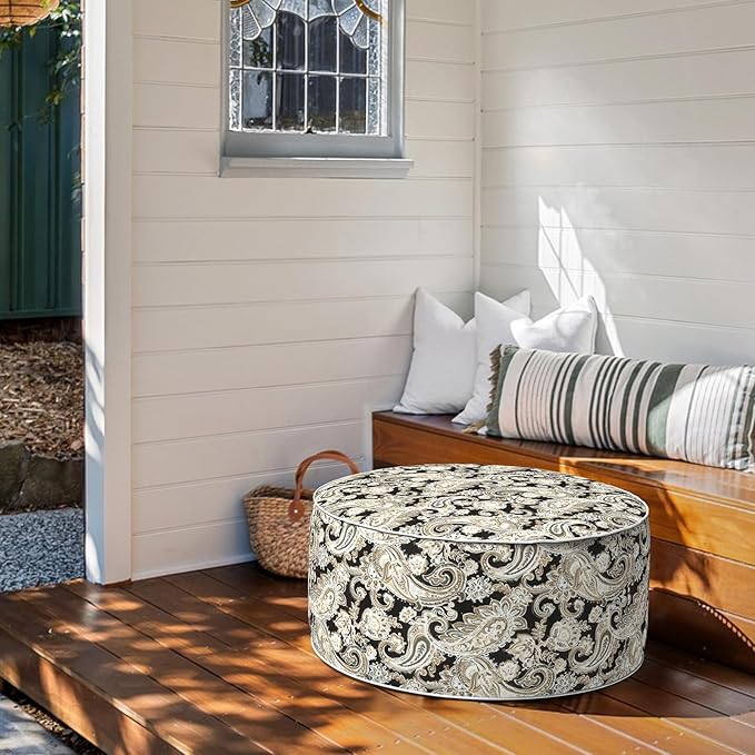 Inflatable Ottoman Stool D31 xH14 for Outdoor/Indoor Use, Water Repellent Patio Foot Rest Stool with Portable Handle,Round Pouf Ottoman Suitable for Garden,Deck and Camping - Paisley Black