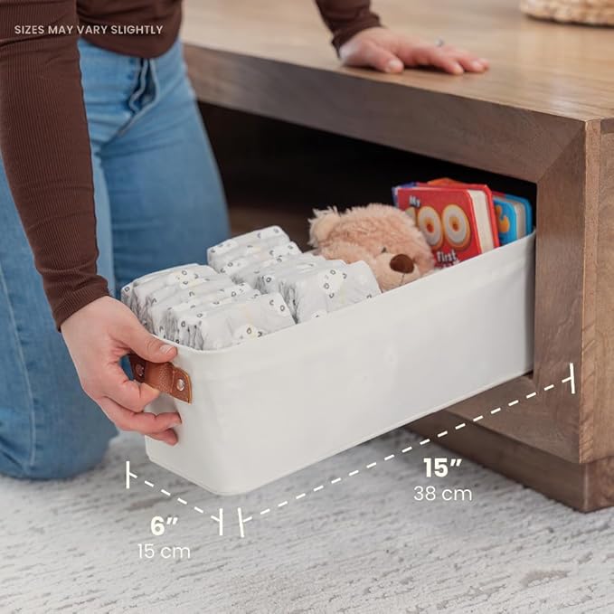 - Decorative Fabric and Vegan Leather – These versatile storage baskets for organizing your everyday life are made with a thick, high-quality fabric and fitted with leather handles to add a stylish touch to a living room, bedroom, office, or personal space.