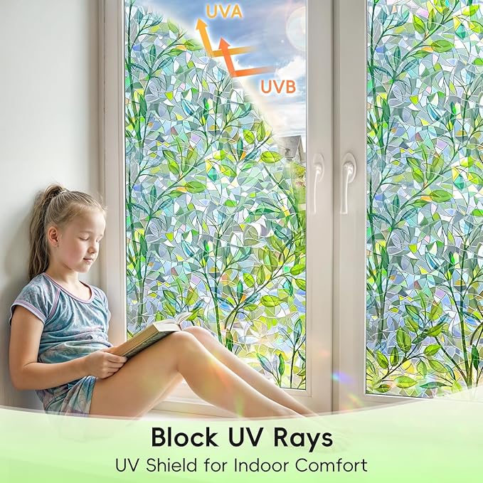 - Charming Visual Effect: When sunlight passes through this colorful stained glass window film, the window displays a mesmerizing rainbow effect, adding a decorative touch to your space. The green leaf pattern radiates a fresh, natural vibe under the light, combining with the rainbow glow to create a stunning visual experience that enhances the beauty and style of your space