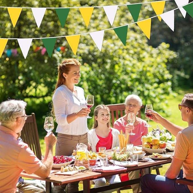 - Easy to Use: These yellow green and white triangle flags are very simple to install and use. You can easily decorate walls, bedrooms, restaurants, ceilings, fireplaces, windows, gardens, branches, fences, restaurants, bars, etc with the pennant banner flags to create a wonderful activity scene