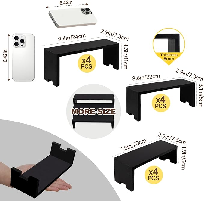- ใWooden Tierd Risers for Displayใ๐: This 4 set 3 tier small display shelf for cupcakes or vendors has stackable nesting design, so the wooden display risers easily access as desktop storage racks,also they has strong load-bearing capacity for more kinds perfumes, collectible figures,kitchen condiment bottles, bathroom toiletries because of varieties size of (L7.8''/20cm-8.6''/22cm-9.4''/24cm)XW2.9'' /7.3cm
