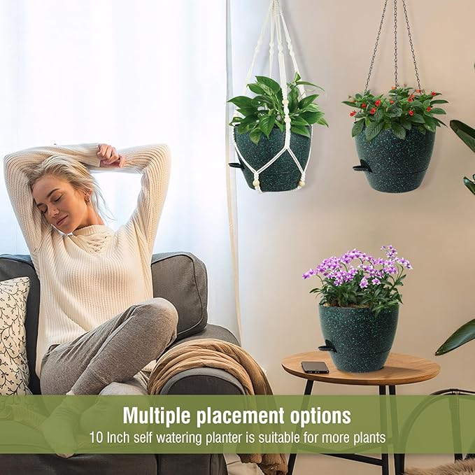 - 【Self-Watering Hanging Planter with Removable Tray】This hanging flower pot comes with a detachable bottom tray that acts as a water reservoir, holding a good amount of water. When your plant needs water, it’s absorbed through cotton wicks from the reservoir to the soil, reducing how often you need to water