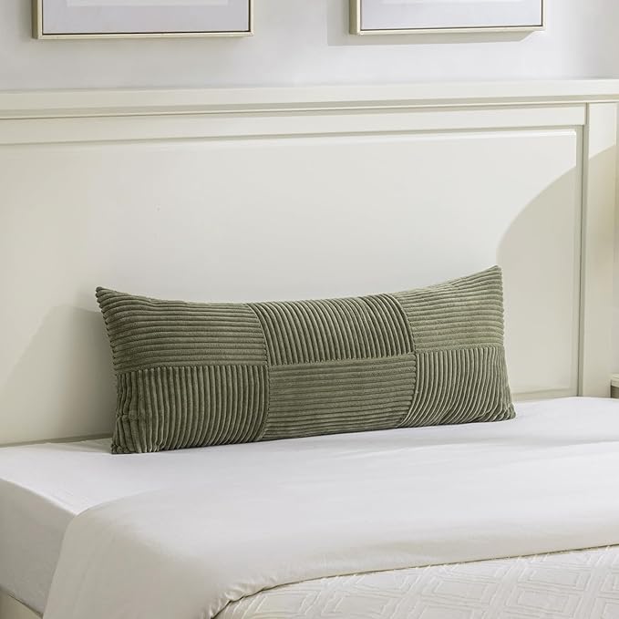 Fancy Homi Set of 2 Olive Green Boho Long Lumbar Body Decorative Throw Pillow Cover 14x36 Inch for Bed Couch Bedroom Bench, Soft Patchwork Corduroy Textured Pillow Case, Rustic Farmhouse Room Décor