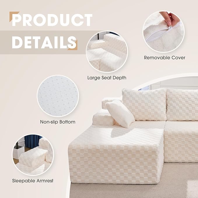 Hobestluk 96” Modular Sectional Sofa Couches L-Shape Couch 3 Seat Modular Sofa Memory Foam Sectional Couches for Living Room, Cloud Couch with Oversized Chaise (White, Checked (Left Facing Chaise))