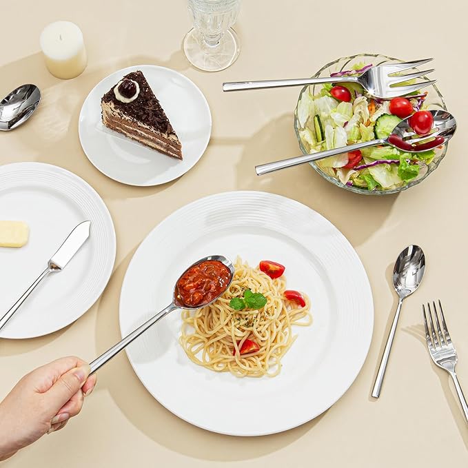 - DESIGN AND APPEARANCE: Mirror finish, natural and elegant design.Smooth and silk surface without grain, easy to clean and care in daily use. Crafted forged process,strong and durable,so that the flatware set has a thicker texture