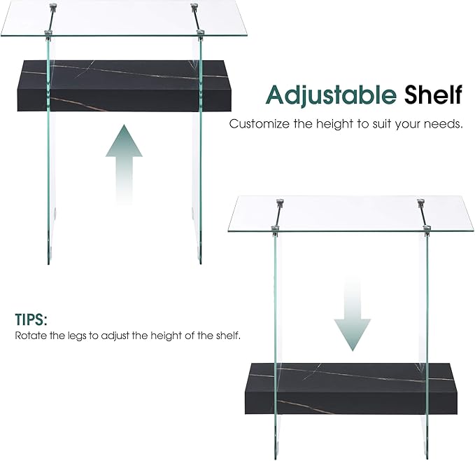 - Modern Glass Console Table: 8mm thick clear tempered glass tabletop with a smooth, beveled edge provides a perfect platform for framed photos or a stylish pair of lamps. Meanwhile, the two-tempered glass leg below gives your home an on-trend look. The console table can hold a weight capacity of 100 LBS