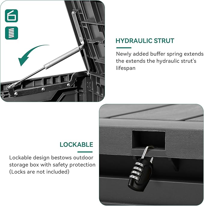 - Versatile and Secure: Our resin storage box is designed for both indoor or outdoor use, suitable for storing patio furniture cushions, gardening tools, pool accessories, and more; The deck box with lock design ensures your items stay safe and secure