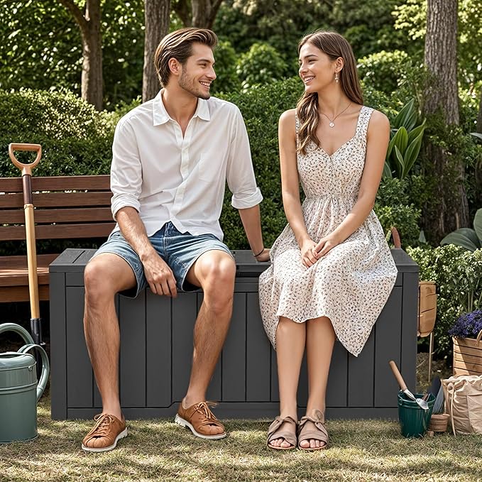 - Extra Seating: Doubling as a comfortable bench seat, this plastic deck box can support up to 485 pounds; Set it up in just 15-30 minutes, and enjoy its unique wood-grain texture that seamlessly blends with any patio or deck decor in no time