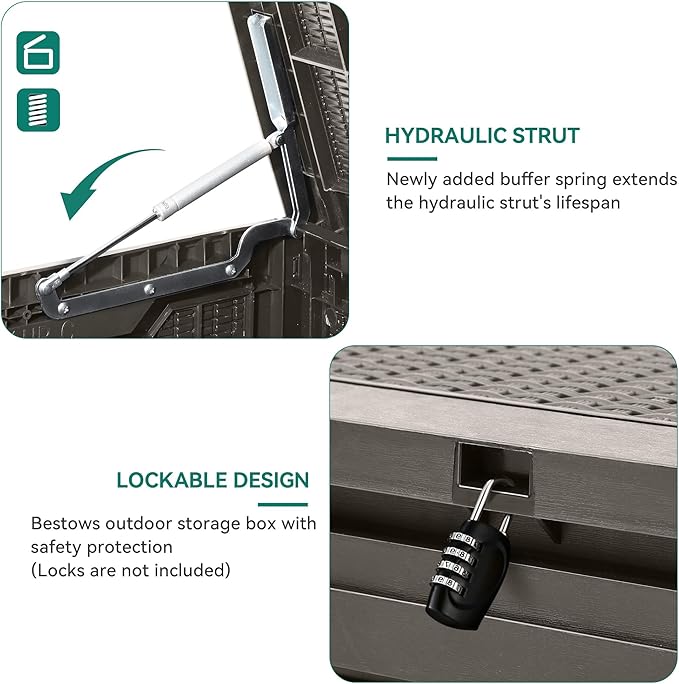 - Versatile and Secure: Our resin storage box is designed for both indoor or outdoor use, suitable for storing patio furniture cushions, gardening tools, pool accessories, and more; The deck box with lock design ensures your items stay safe and secure