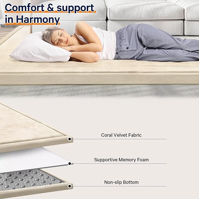 - ๐ฃSAFE & COMFY: Our baby play mat is made of 100% coral velvet material and filled with high-quality 3cm thick memory foam,eco-friendly and durable, providing a safe and comfortable play area for your little ones, without worrying about them hurting themselves on hard floors.The surface of this floor mat is velvet cover, which is not only soft and comfortable to touch, but also has a good cushioning effect.
