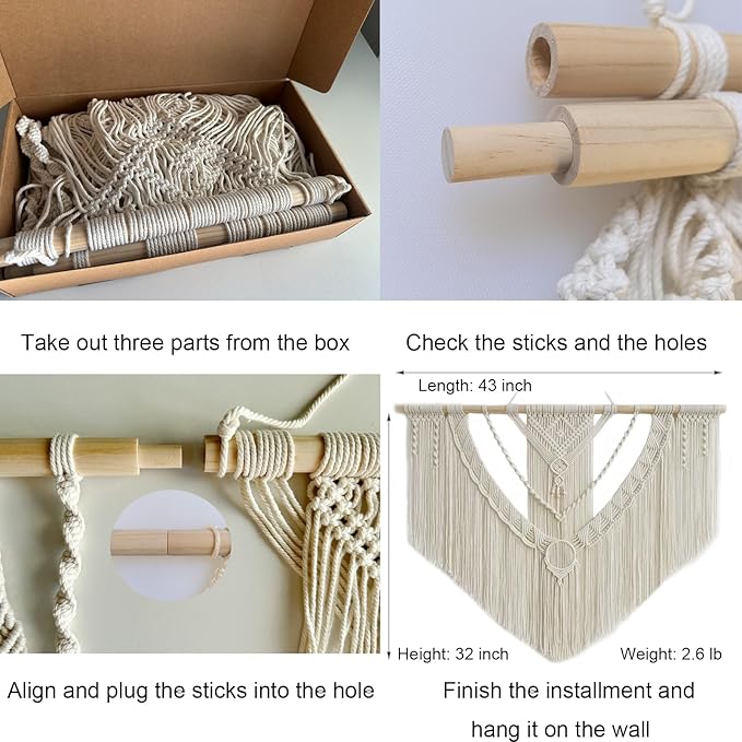 - Easy to Install: The package comes with 3 separate parts of short macrame wall hangings which could be easily connected together with the screws inserted in the wood rod.