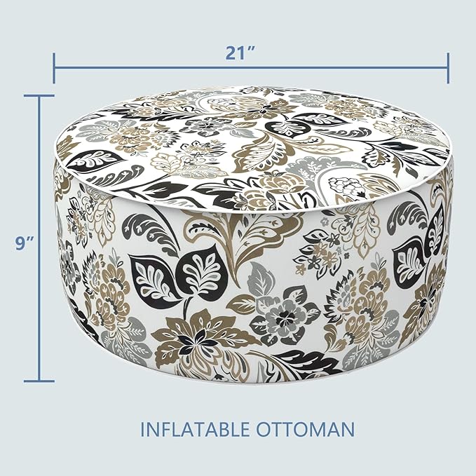 - PACKAGE INCLUDING: FOOT PUMP IS NOT INCLUDED. This value bundle come with 1 pcs indoor outdoor inflatable ottoman measures D21” x H9” (53 x 23cm). Made of durable and soft polyester fabric, sturdy inflatable PVC liners.