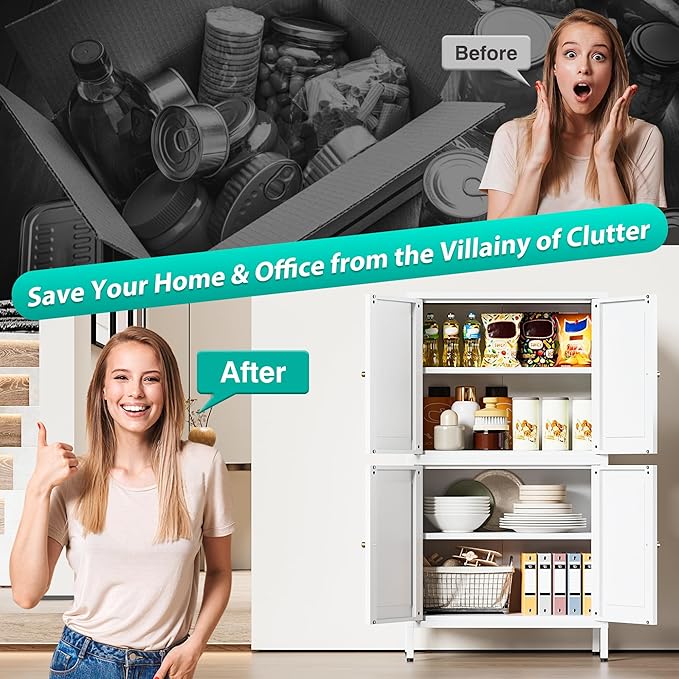 - 【Sturdy,Durable and Safe】: Made of powder-coated steel plate, this white bathroom cabinet is sturdy,durable and easy to clean.Load capacity is up to 120lbs each shelf. The included anti-tip kit helps secure the pantry cabinets to the wall to give you a safer living space.