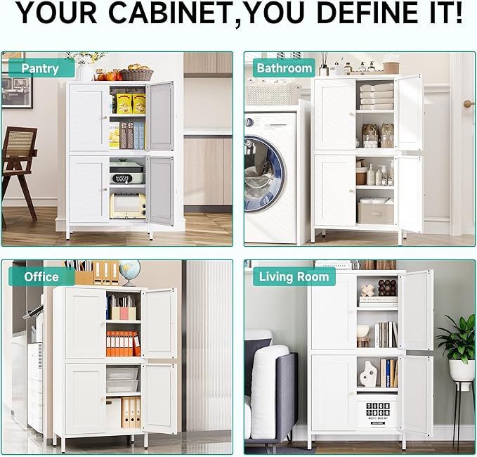 - 【Adjustable Shelves】: With large storage space and 2pc height-adjustable shelves,white cabinet storage can store both short and tall items. Help you organize your home easily;