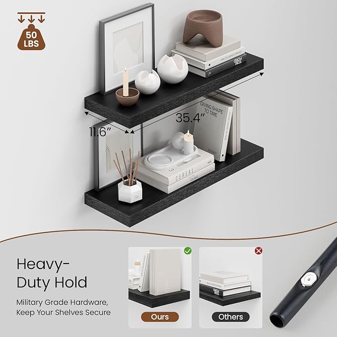 - Extra Deep Floating Shelves: Measuring 11.6” D x 35.4” W x 1.5” H, these shelves are crafted for maximum depth and durability. The spacious 12” depth gives you plenty of room for stylish display, organized storage, and decorative accents. Perfectly suited for your bathroom, kitchen, or living room, they enhance both function and flair in any space!