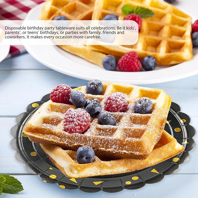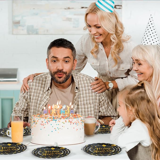 - 【BIRTHDAY PARTY SUPPLIES】:You will receive 50pcs 7inch black and gold happy birthday plates. Excellent for serving salads, desserts, cakes, etc. Enough to meet your party needs, perfect for your birthday party tableware. Serves up to 50 guests.