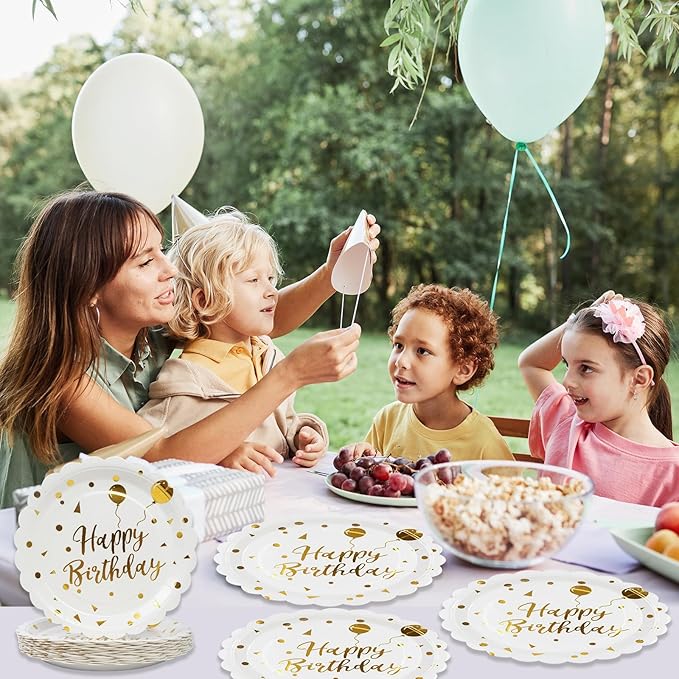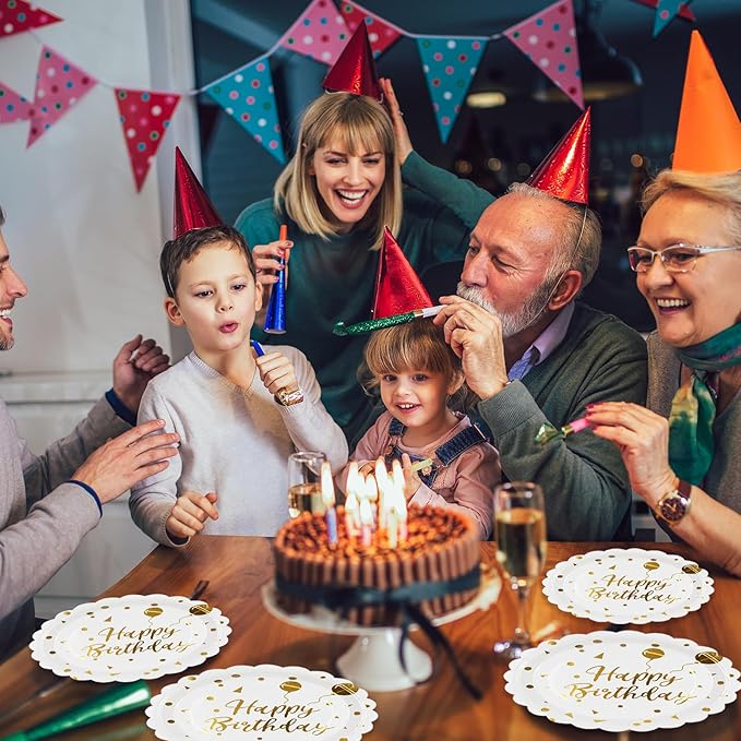 - 【HAPPY BIRTHDAY PLATES】:You will receive 50pcs 7inch white and gold birthday paper plates. Excellent for serving salads, desserts, cakes, etc. Enough to meet your party needs, perfect for your birthday party tableware. Serves up to 50 guests.