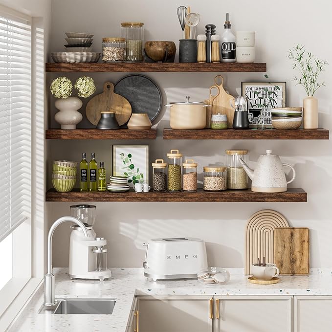 - Perfect Wall Decor: Handcrafted from premium 1.5" thick wood, our wood floating shelves boast a unique wood grain that infuses your space with timeless charm. Perfectly suited for any modern, traditional, rustic, or farmhouse decor, this shelf elevates the ambiance of your home and kitchen. With 4 colors and 4 sizes, you can creatively arrange your storage space with your style.