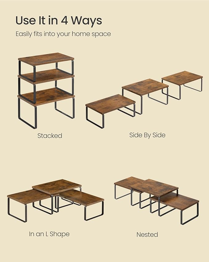 SONGMICS Cabinet Organizer Shelf, Set of 3 Kitchen Counter Shelves, Kitchen Storage, Spice Rack, Stackable, Expandable, Rustic Brown and Matte Black UKCS220K02