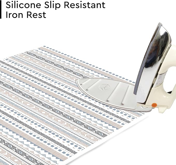 - QUALITY: Pure Cotton Printed fabric laminated with fibre pad for soft and quick ironing. Silicon Mat attached in one corner for keeping the hot iron. Printed fabric is scorch resistant and does not discolour easily . Fibre pad protects Table or Bed from burning as well as allows steam to go through and also holds heat for quick ironing.