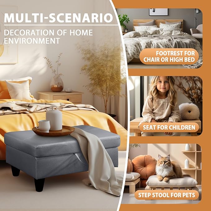 - PREMIUM MATERIALS: This storage ottoman features a thick foam cushion for added comfort. Built with a sturdy solid wood frame and durable plastic feet, it offers long-lasting quality while protecting your floors from scratches. The easy-to-clean faux leather surface gives it a sleek, modern look, and the smooth faux leather lid adds an extra layer of comfort for sitting. Perfect for any room, this ottoman combines style, durability, and functionality.