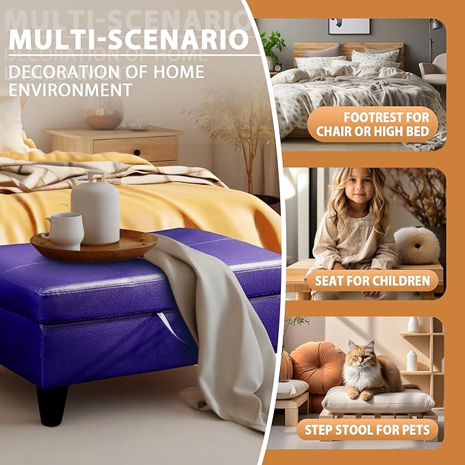- STORAGE OTTOMAN: This ottoman offers storage space for pillows, blankets, shoes, seasonal items, books, toys, and more. Its hinged design allows the lid to stay open effortlessly and ensures a soft, controlled close. Perfect for organizing and decluttering your living space, this storage ottoman adds both style and functionality to your home.