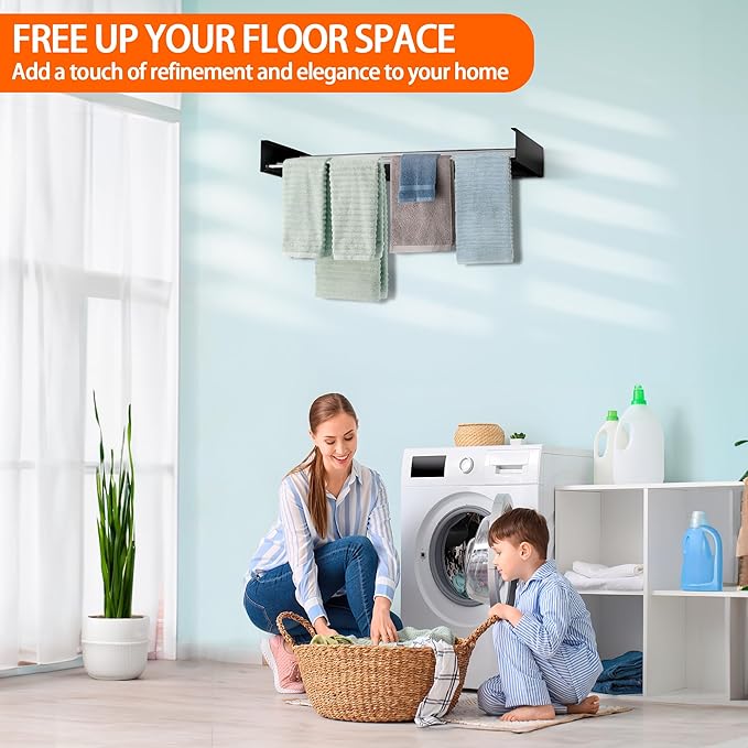 FOCHIER F Laundry Drying Rack Wall Mounted Clothes Drying Rack Collapsible with 5 Aluminum Rods and Drilling Template Long Screwdriver Bit 60 lbs Capacity (Black, 23.6“)