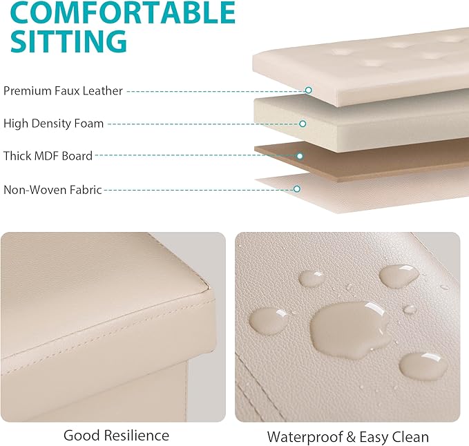 - 【Sturdy & Durable】This comfortable long storage ottoman is made of quality thick cardboard, durable faux leather, has the load bearing capacity up to 350lbs. Waterproof linen fabric, built-in thickened sponge, make the cushion is soft and comfortable. Beige unit you see everywhere and a perfect match to your couch or dining room chairs