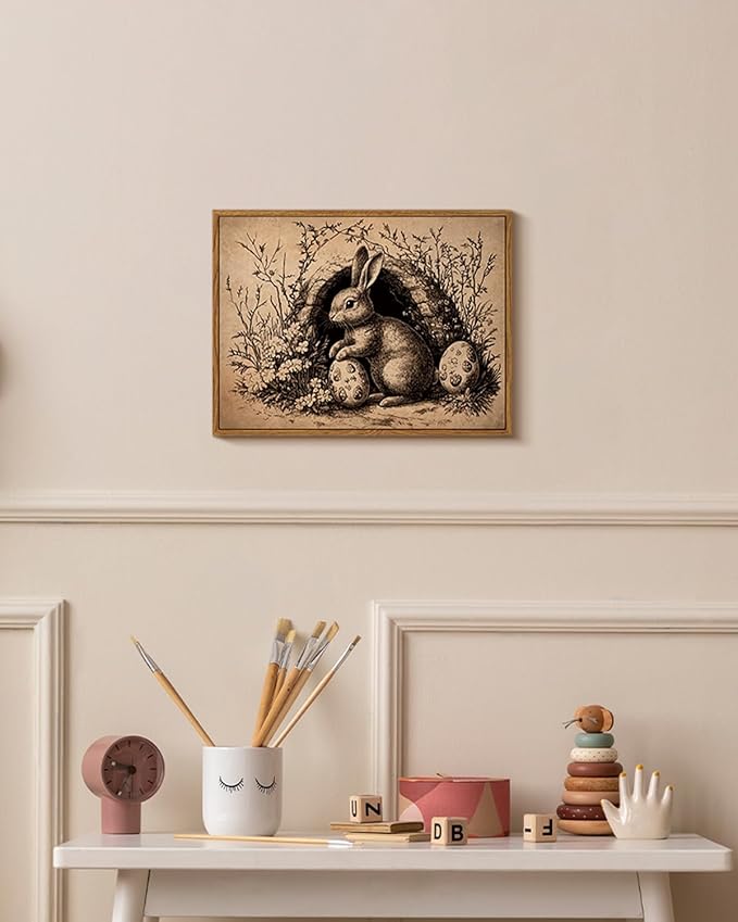 VIYYIEA Framed Wall Art for Living Room, Easter Bunny Egg Canvas Prints, Vintage Home Decor, Rabbits Painting Picture, Bathroom Wall Decor Gifts for Friends or Family -【Easter Collector】-(16L x 12W)