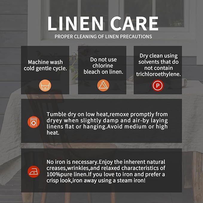 - CARE INSTRUCTION: Do not bleach, dry clean, or use detergent with chlorine. Machine wash cold separately with a gentle cycle. Low tumble dries or iron if needed. It is normal for some lint in the first few washes, regular washing will make linen table clothes softer