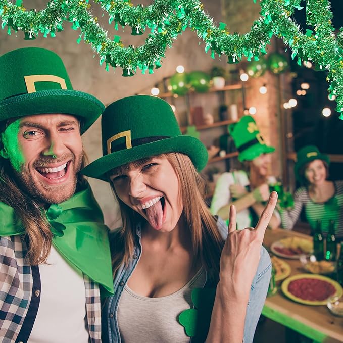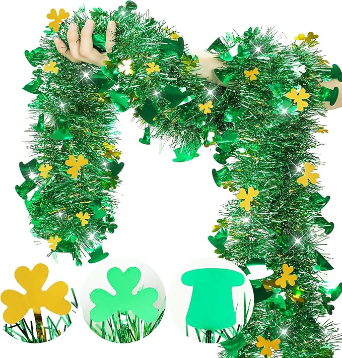 33 FT St Patricks Day Garland with Gold Green Shamrock Hat Tinsel Garland,Shiny Metallic Garlands St Patricks Day Decor for Home Indoor Outdoor St Patricks Party Supplies