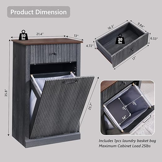 - Tilt-Out & Hidden Design: The tilt out trash cabinet measures 13"D x 21.4"W x 35.8"H and this laundry basket cabinet holds a 10 gallon trash can. (Package includes 1 soft laundry basket). It effectively conceals trash without taking up extra space, keeping your kitchen neat and floors clean. This design is perfect for hiding waste, preventing pets from accessing it, and isolating dirty laundry from odors,helping maintain a fresh indoor environment