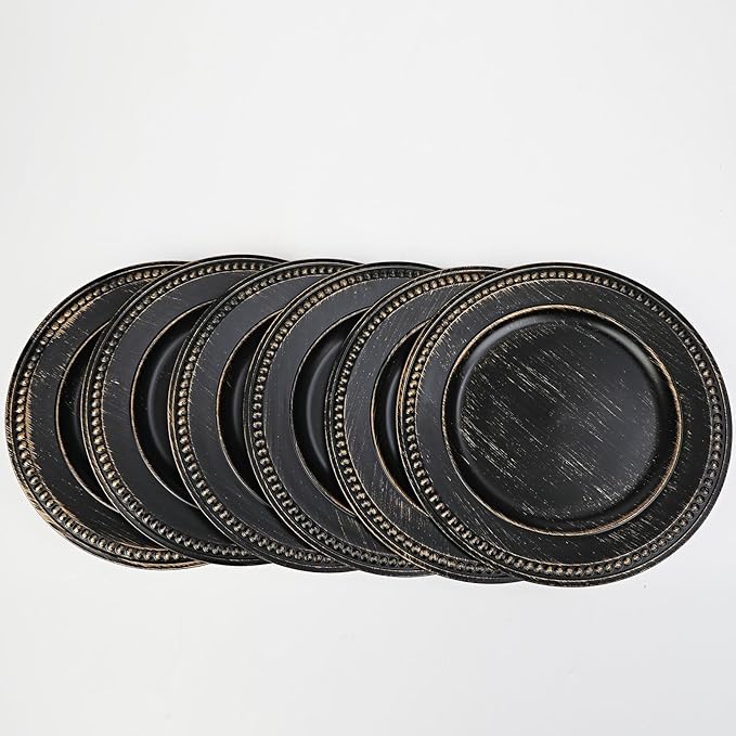 13" Vintage Charger Plates Set of 6, Beaded Charger & Service Plates, Chargers for Dinner Plates Bulk Wedding Christmas Event Holiday, Elegant Table Setting Centerpieces, Black