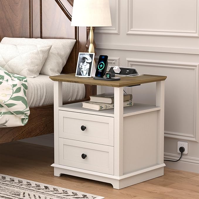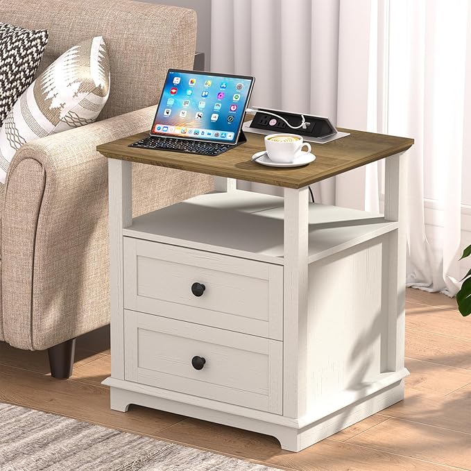 HIFYOBRO End Table with Flip Top Charging Station and 2 Drawers, Type-C & USB Port & Power outlets, Wooden Storage Cabinet, Large Side Table with Storage for Living Room and Bedroom (White)