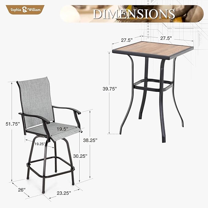 - 【Bar-height Patio Table and Chairs】Combines ergonomic high back design with seamless swivel functionality, this bar set provides a stylish and elevated seating option that adds flair to any space. Patio bar table features elegant wood-like table top