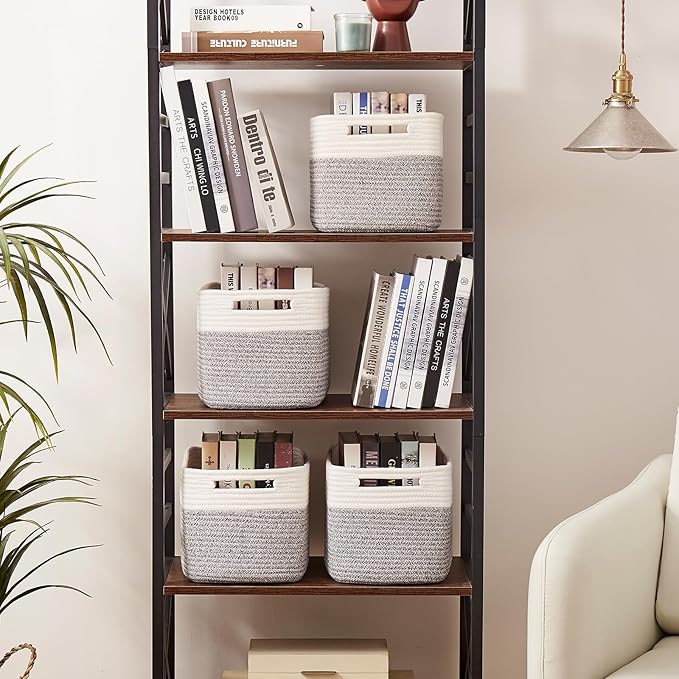 OIAHOMY 4 Pack Storage Baskets for Organizing, Basket for Shelves with Handle, Woven Baskets for Storage Toys, Towels, Books, Cotton Rope Basket 13" L x 9 " W x 7.8 " H, Grey & White