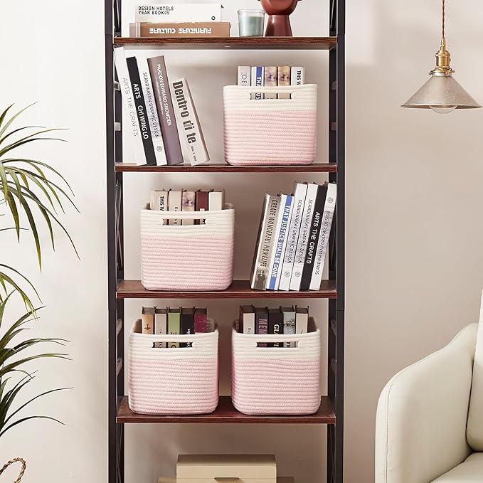 OIAHOMY 4 Pack Storage Baskets for Organizing, Basket for Shelves with Handle, Woven Baskets for Storage Toys, Towels, Books, Cotton Rope Basket 13" L x 9 " W x 7.8 " H, Pink & White