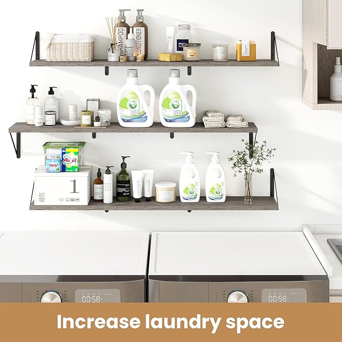 Heimlove 48 Inch Large Floating Bookshelves Set of 3,Wall Mounted Bookshelves,Heavy Duty Bracket Shelves for Living Room,Bedroom,Kitchen,Laundry Room Storage & Decor,Rustic Silver Grey