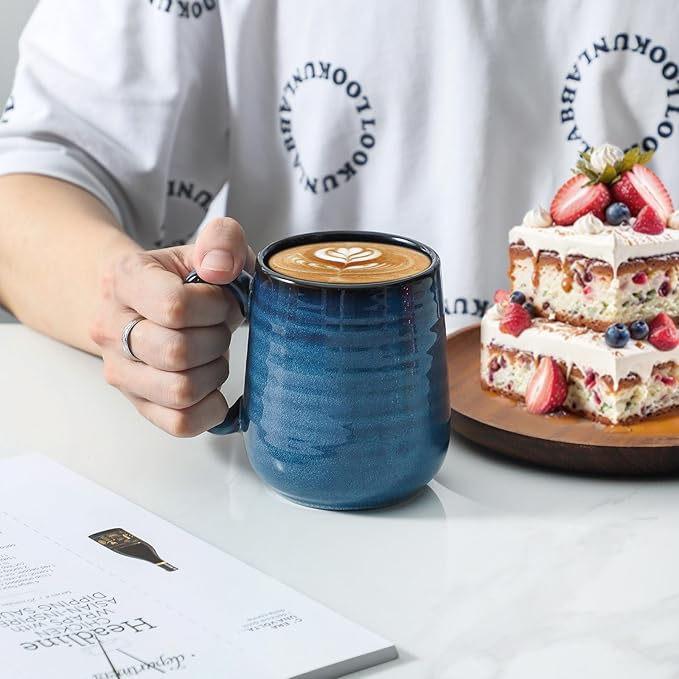 - Functional And Practical: The blue mugs measure 4.7*3.1*4.1inch which is large and deep to hold any of your favorite beverage. With a capacity of 15 oz, these mugs set are perfect size to hold coffee, tea, milk, cocoa, cappuccino and hot chocolate. Suitable for home, office, party, holiday and wedding anniversary