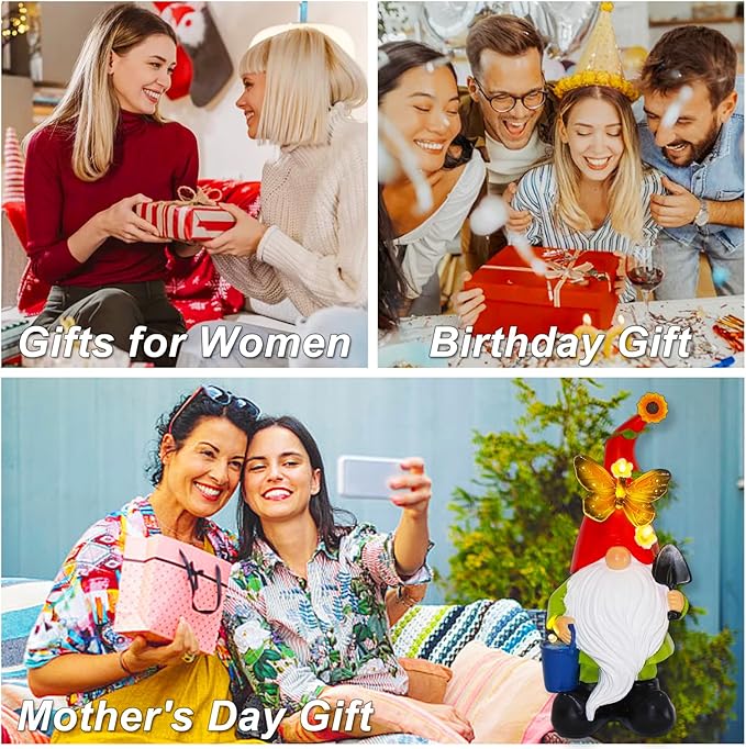 - Unique Solar Garden Gnomes Statues Gift: The cute solar garden gnome is a perfect Gifts for Women, Family, Friends, Neighbors, Gardening Enthusiasts, Mom and Grandma, and can also be a gift for Mother's Day, Birthdays and Housewarming Parties