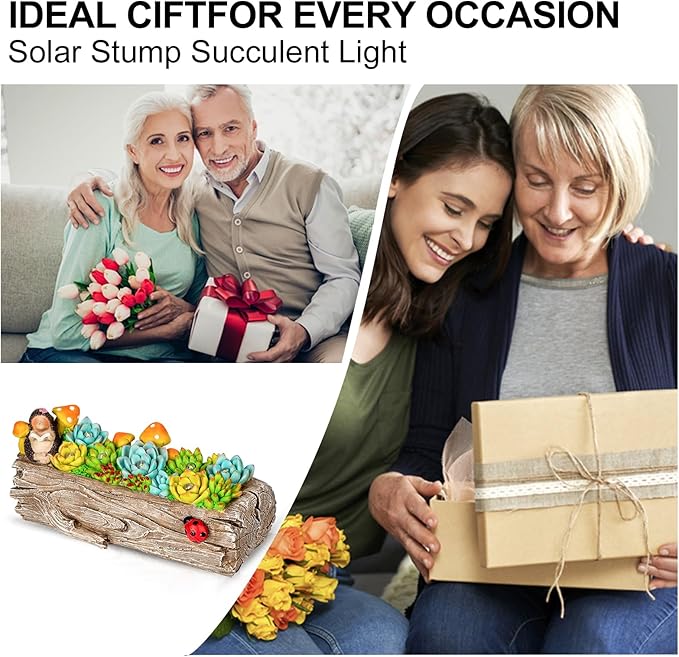 - [Succulent Gifts] Enhance your shopping experience with this unique solar garden succulent statue! Featuring a stump design with a succulent, Placed in the yard, as if transported to the dream garden. it's the perfect gift for women, mothers, and grandmothers. Not only does it add charm and utility to your outdoor space, But it also brings joy to your loved ones.