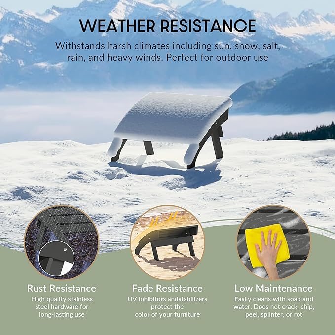 - All Weather Resistant: This Adirondack foot rest are made of HDPE plastic, its weather resistant and UV fade resistant material can withstand in various enviromental pressure and not easy to dent, crack , peel or rot as wood.